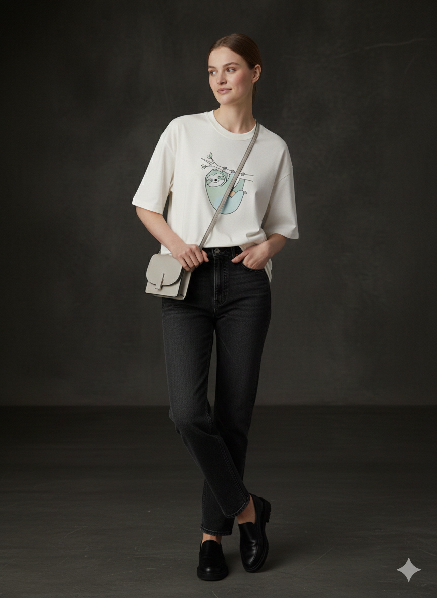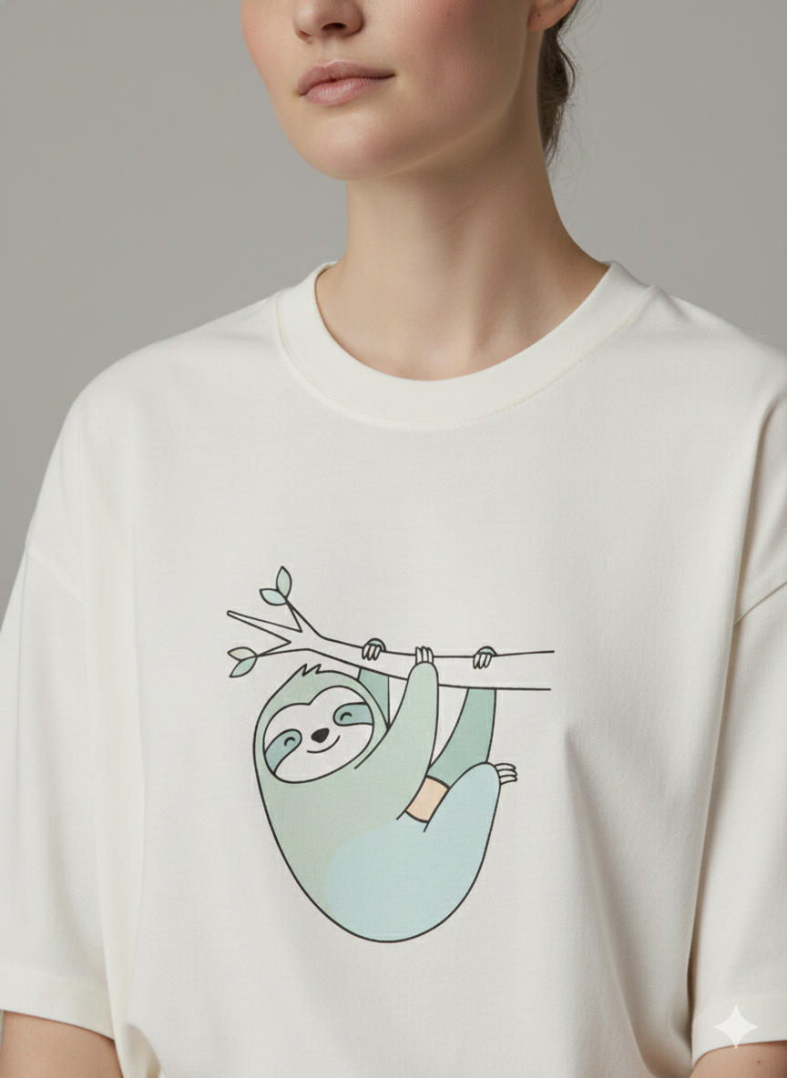 Soft cotton oversized women’s t-shirt with a cute sloth graphic. Comfortable, stylish, and perfect for everyday casual wear.